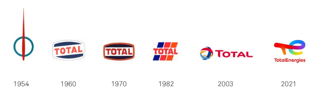 Le dernier changement de logo et d’identité visuelle remonte à 18 ans, en 2003, suite aux fusions avec PetroFina et Elf. Ce changement notable a marqué un tournant stratégique en intégrant pour la première fois de nouvelles couleurs dans le logo et en réinstaurant le nom Total (en majuscules un peu moins imposantes et plus dynamiques) qui avait temporairement cédé sa place à TOTALFINAELF. Le précédent logo de 1982, avec des losanges bleu rouge et orange, avait quant à lui tenu 21 ans. On espère donc pour TotalEnergies que ce nouveau logo ait également une longue durée.