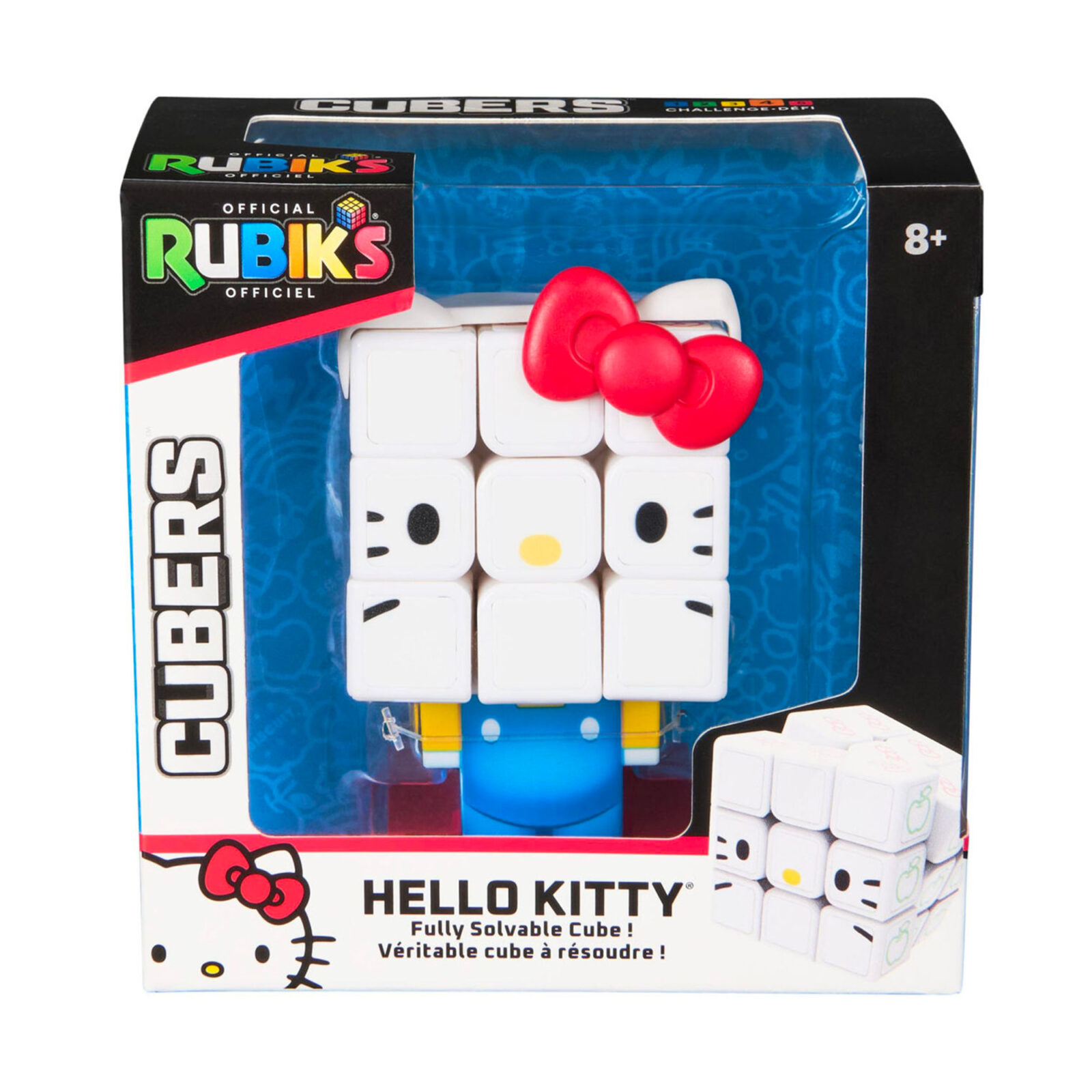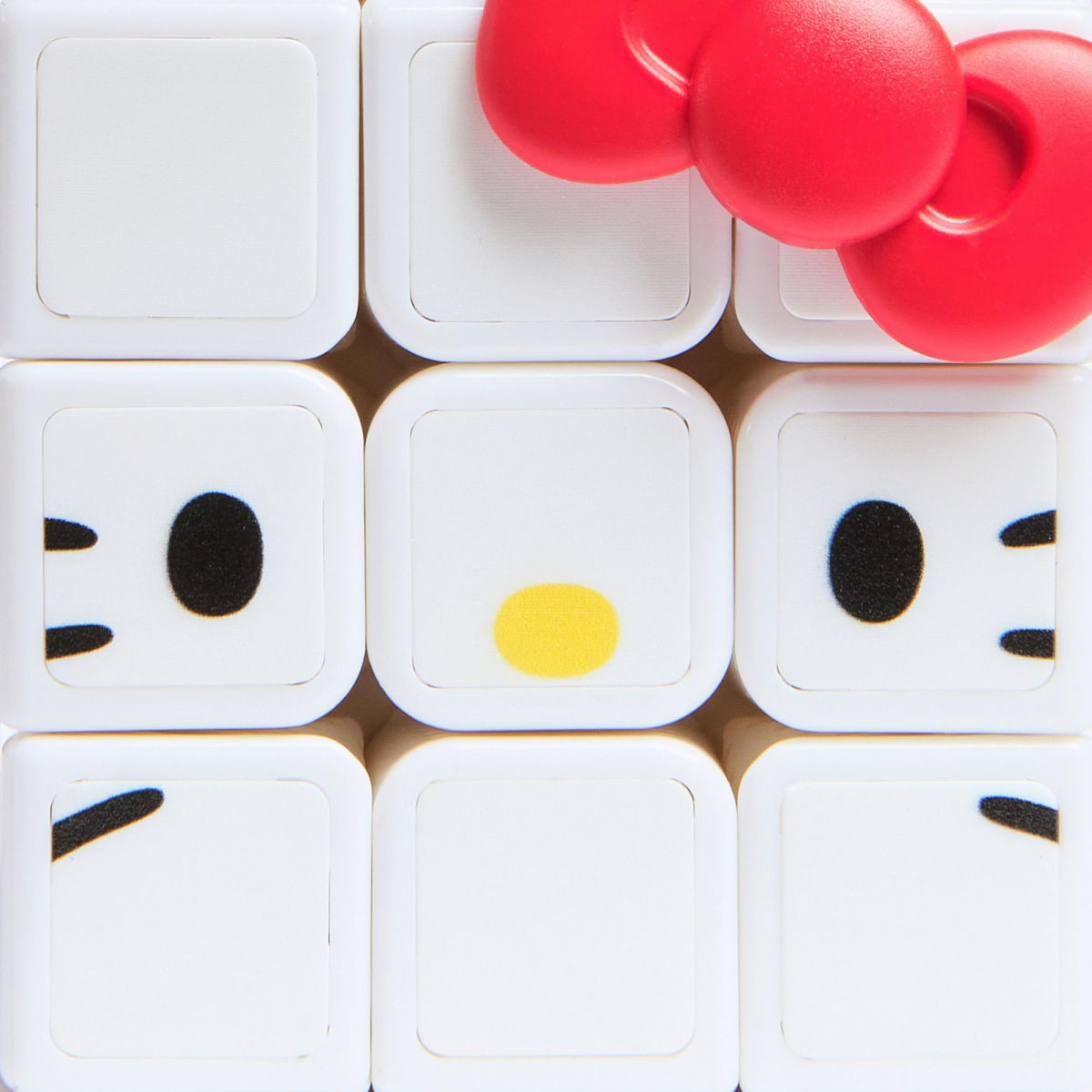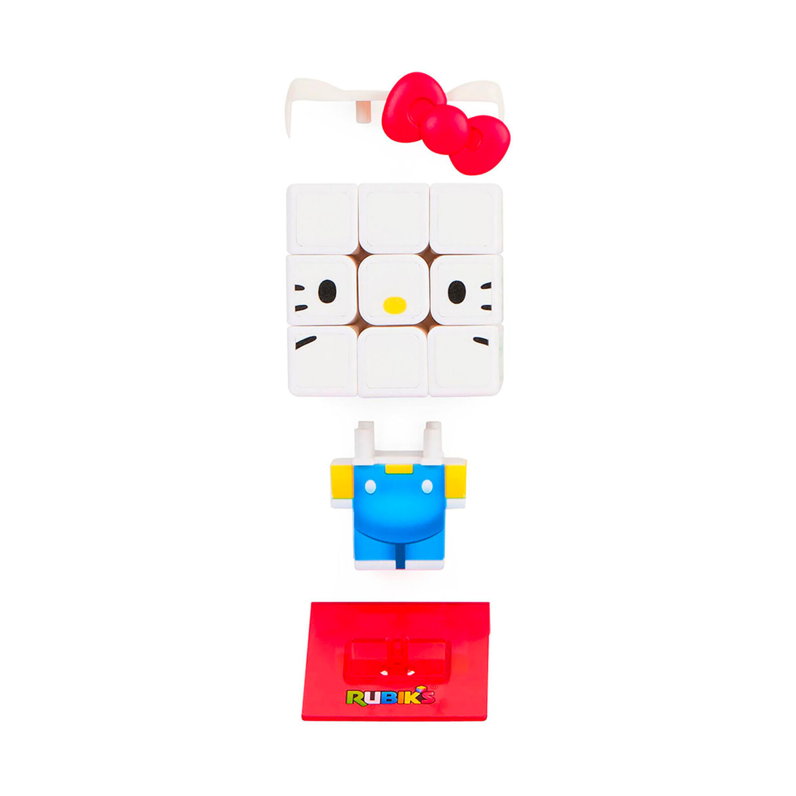Cette édition conserve la célèbre grille 3×3 mais ajoute une touche inédite. Les faces du cube sont ornées de motifs inspirés de Hello Kitty : son nœud rouge emblématique, ses oreilles, et d’autres éléments issus de son univers tendre et coloré. En prime, le casse-tête inclut un support décoratif reprenant les salopettes bleues caractéristiques du personnage.