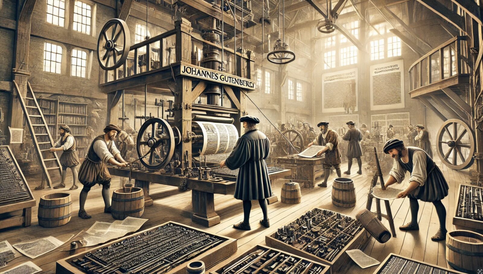 Imprimerie de Gutenberg: Invention de la presse à imprimer à caractères mobiles en plomb, permettant une production de masse de livres.